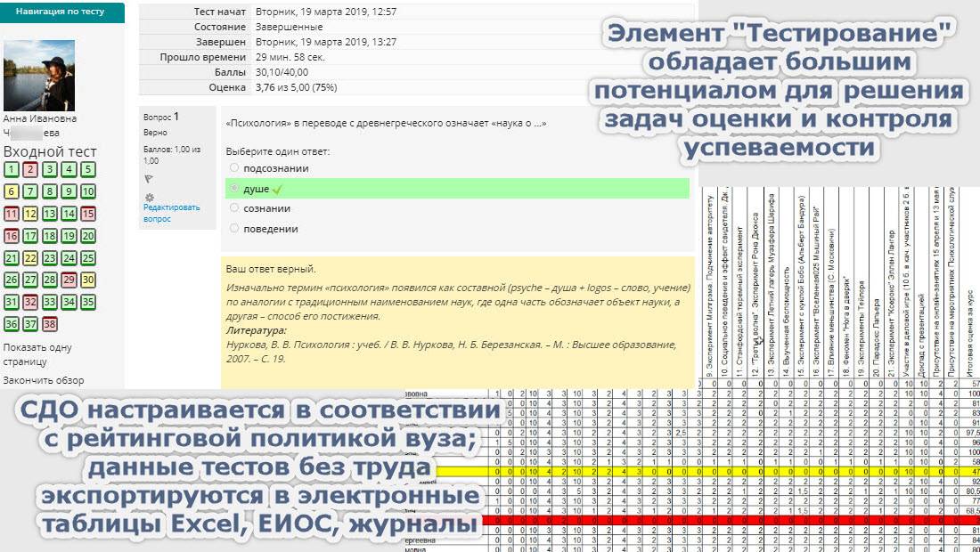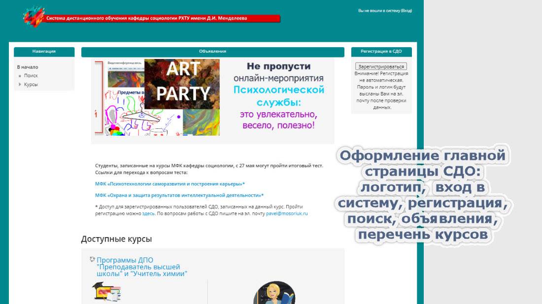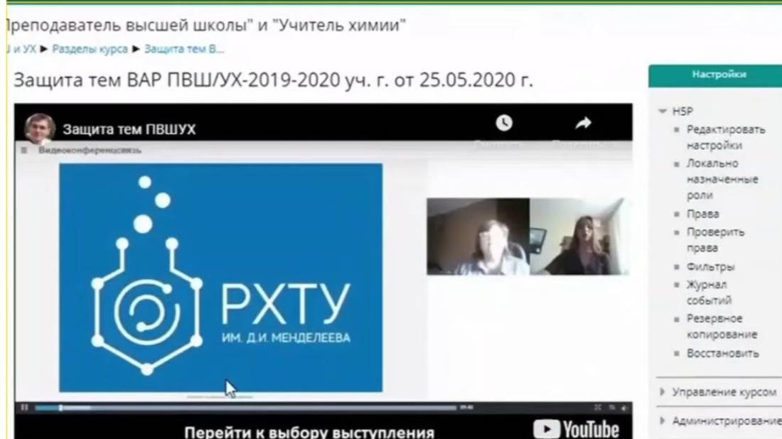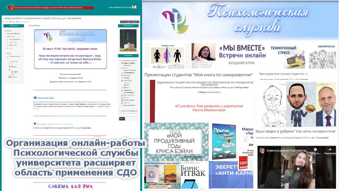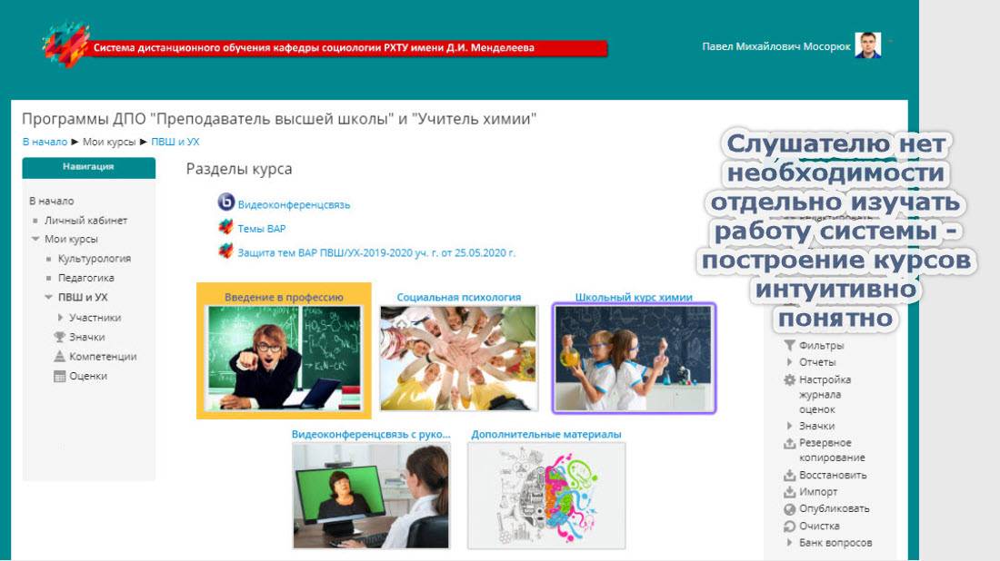 В 2018 г. начата адаптация учебных материалов для электронных курсов ДПО "Учитель химии" и "Преподаватель высшей школы", организуемых кафедрой социологии РХТУ им. Д.И. Менделеева (1080 часов, 40-60 слушателей в потоке). За счет применения СДО возросла эффективность самостоятельной работы слушателей, значительно снизилась нагрузка на профессорско-преподавательский состав.