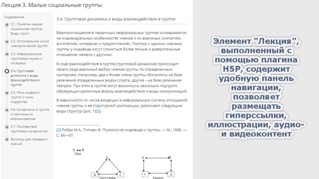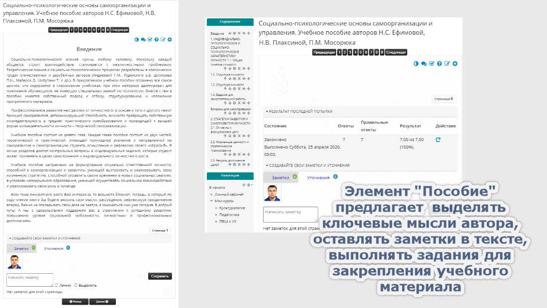 Реализованные проекты отличают дружественный интерфейс и яркий дизайн, динамичность образовательного контента и его согласованность с учебно-методической документацией. Среди инструментов - SCORM (редактор Articulate), H5P, Prezi, API-интеграции, высокопроизводительный виртуальный сервер с системой видеоконференцсвязи. Ниже представлены некоторые из разработок: