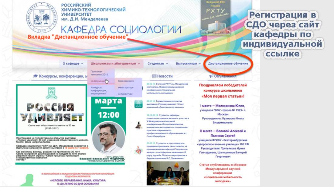 В феврале-марте 2020 г., в связи с эпидемиологической обстановкой COVID-19, все дисциплины кафедры социологии были оперативно переведены в формат СДО, составлены подробные инструкции по работе с системой для преподавателей, обеспечена непрерывность учебного процесса (поток - более 1200 студентов).