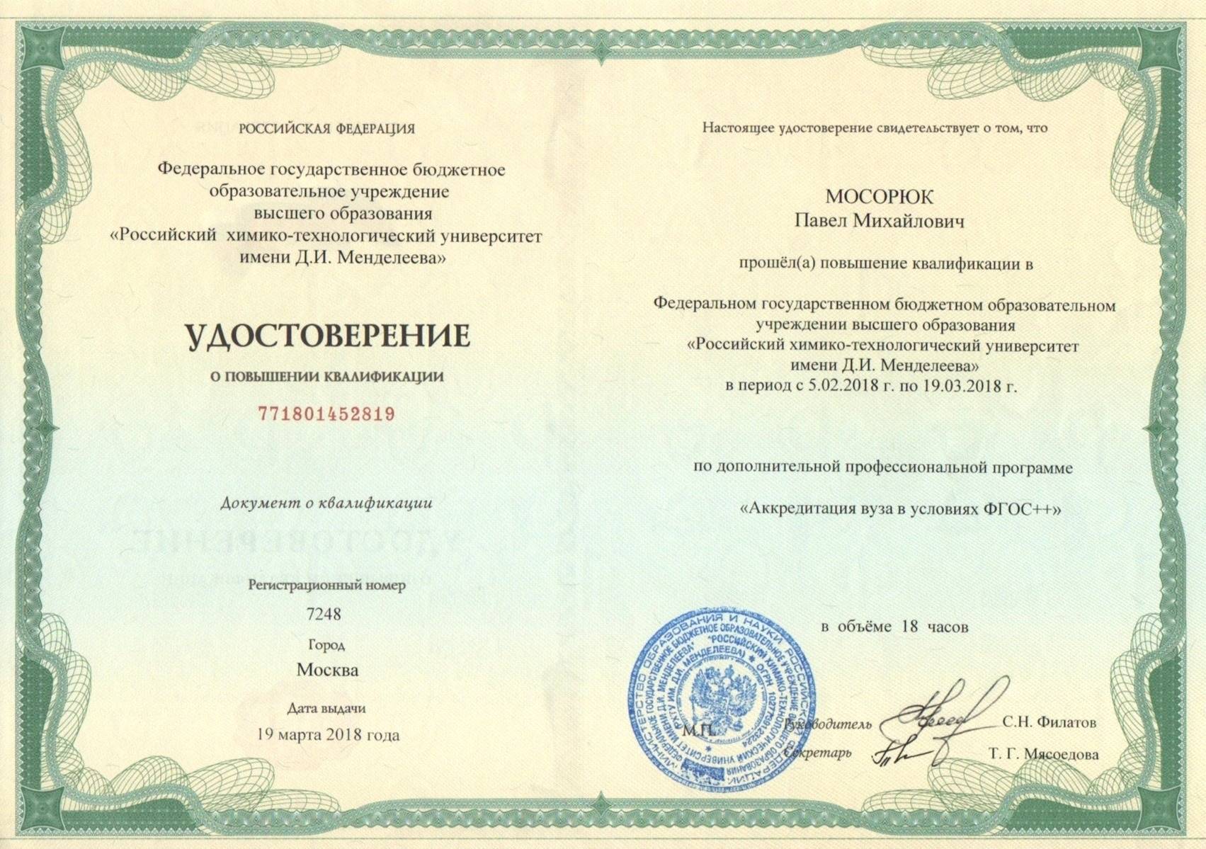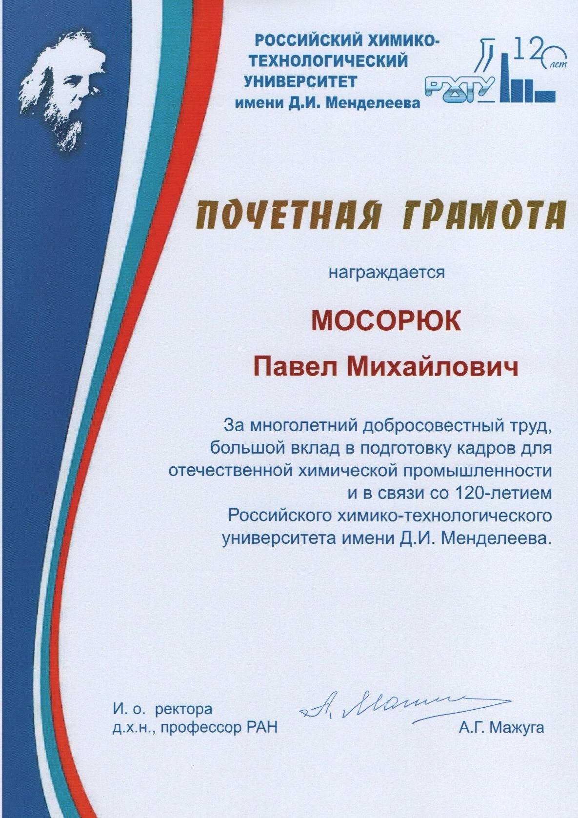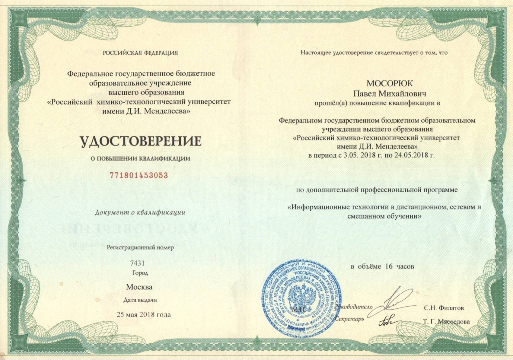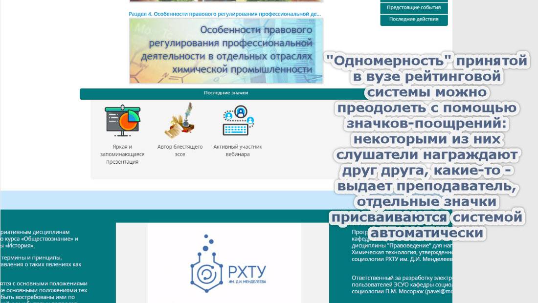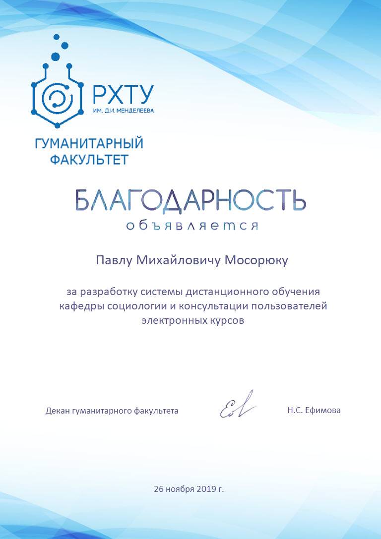 В октябре 2019 г., по результатам Конкурса проектов повышения конкурентоспособности образовательных программ РХТУ им. Д.И. Менделеева, победившим в номинации "Разработка и внедрение программ on-line обучения с использованием дистанционных образовательных технологий" был признан проект, в котором я выступал в качестве руководителя.