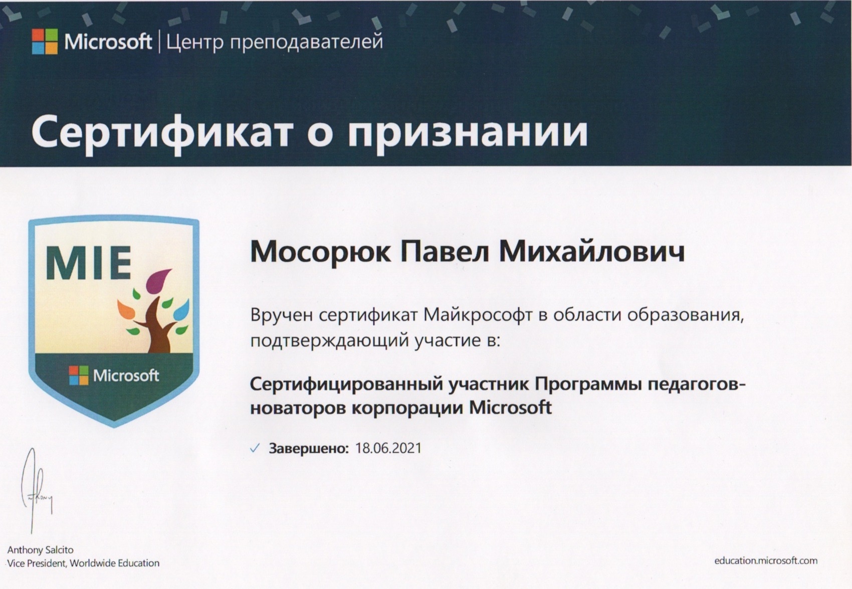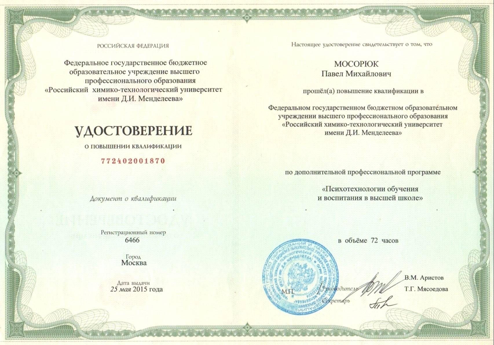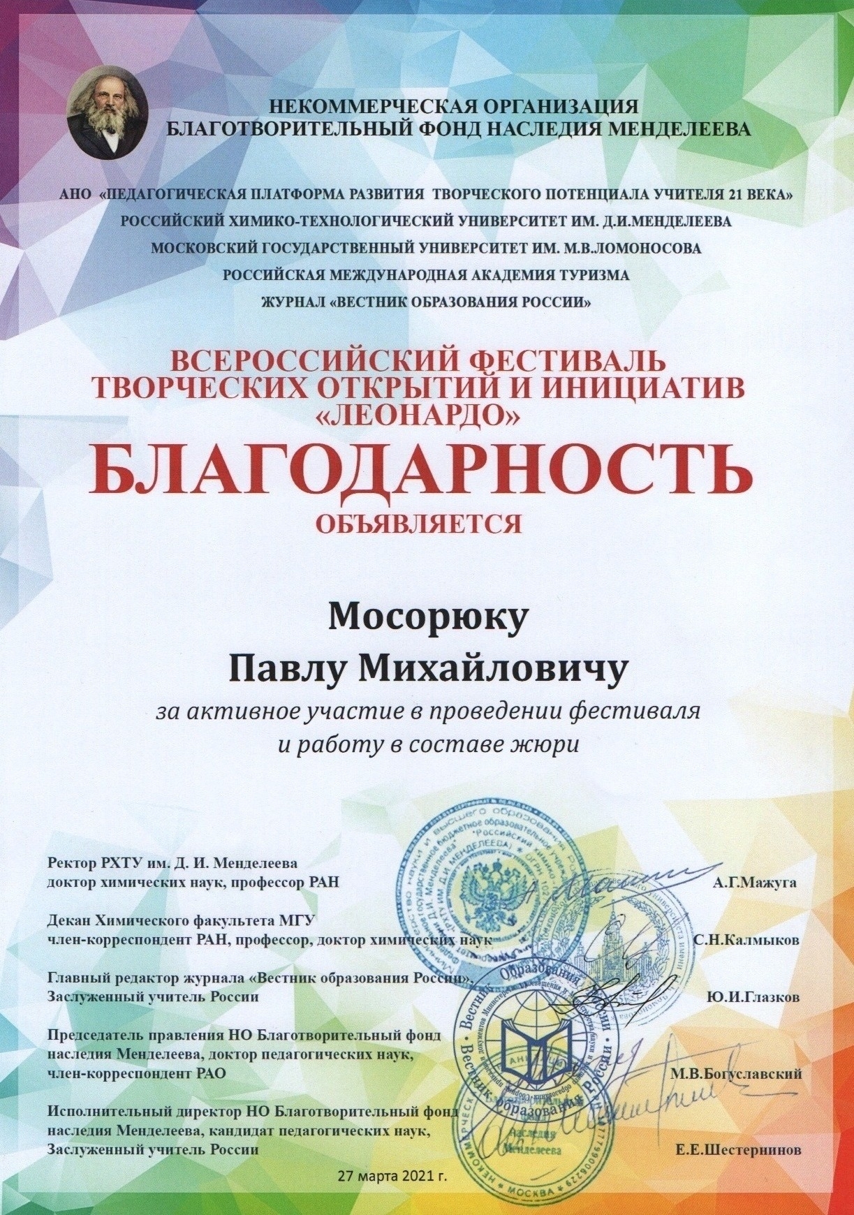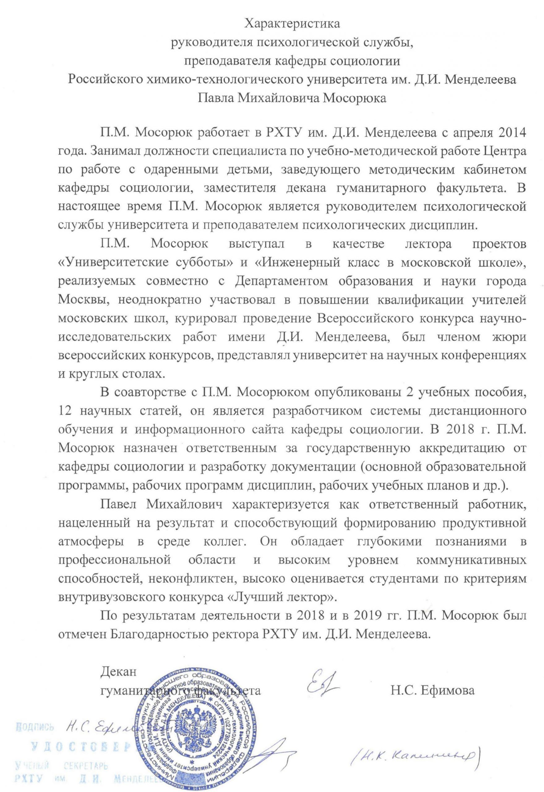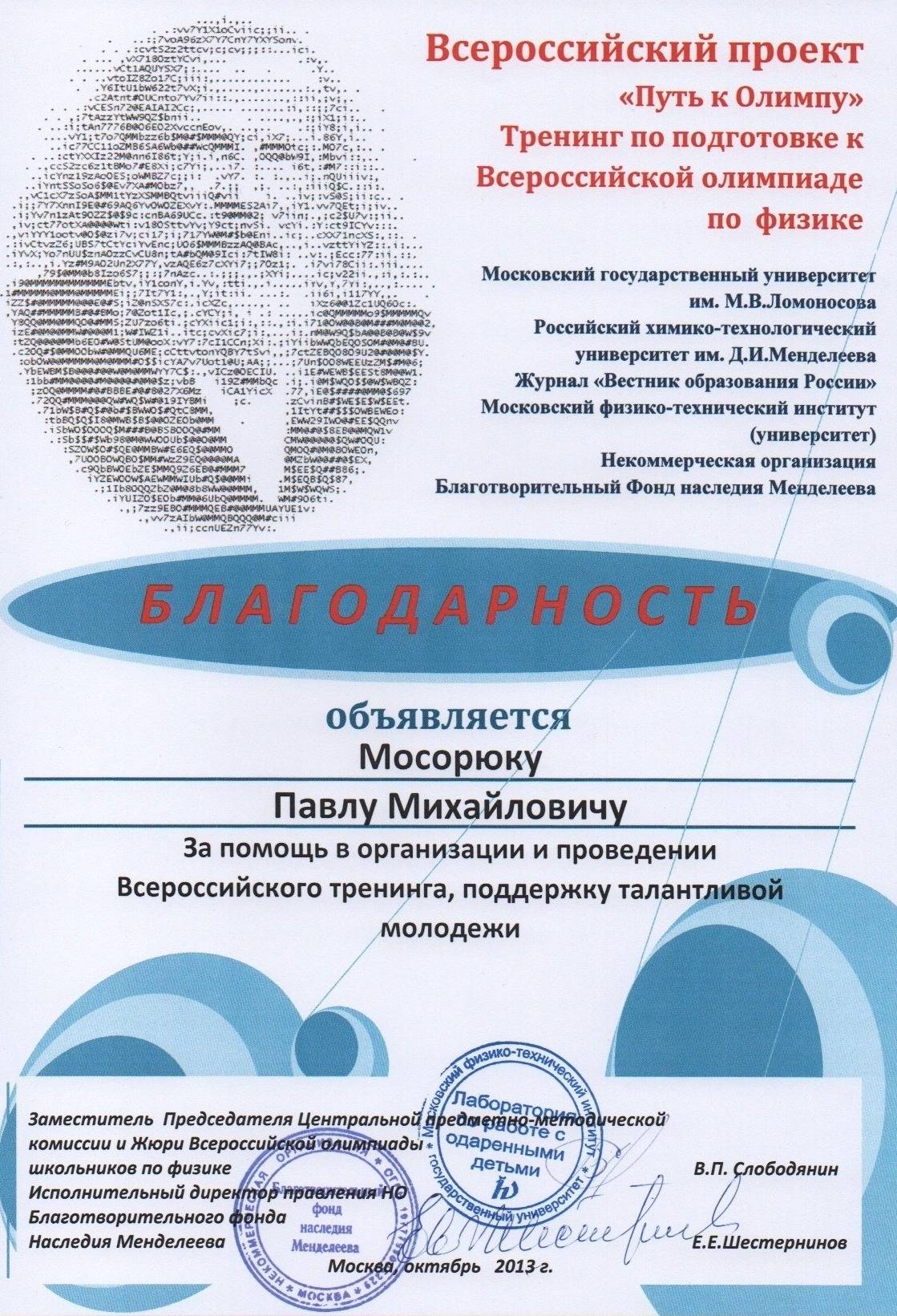 В октябре 2019 г., по результатам Конкурса проектов повышения конкурентоспособности образовательных программ РХТУ им. Д.И. Менделеева, победившим в номинации "Разработка и внедрение программ on-line обучения с использованием дистанционных образовательных технологий" был признан проект, в котором я выступал в качестве руководителя.